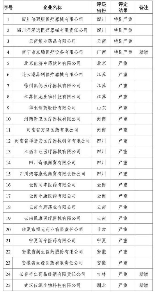 日前,国家医保局医药价格和招标采购指导中心发布了截至2024年3月31日各省份评级为“特别严重”和“严重”失信的医药企业情况,其中4家医药企业评级为“特别严重”,21家医药企业评级为“严重”。